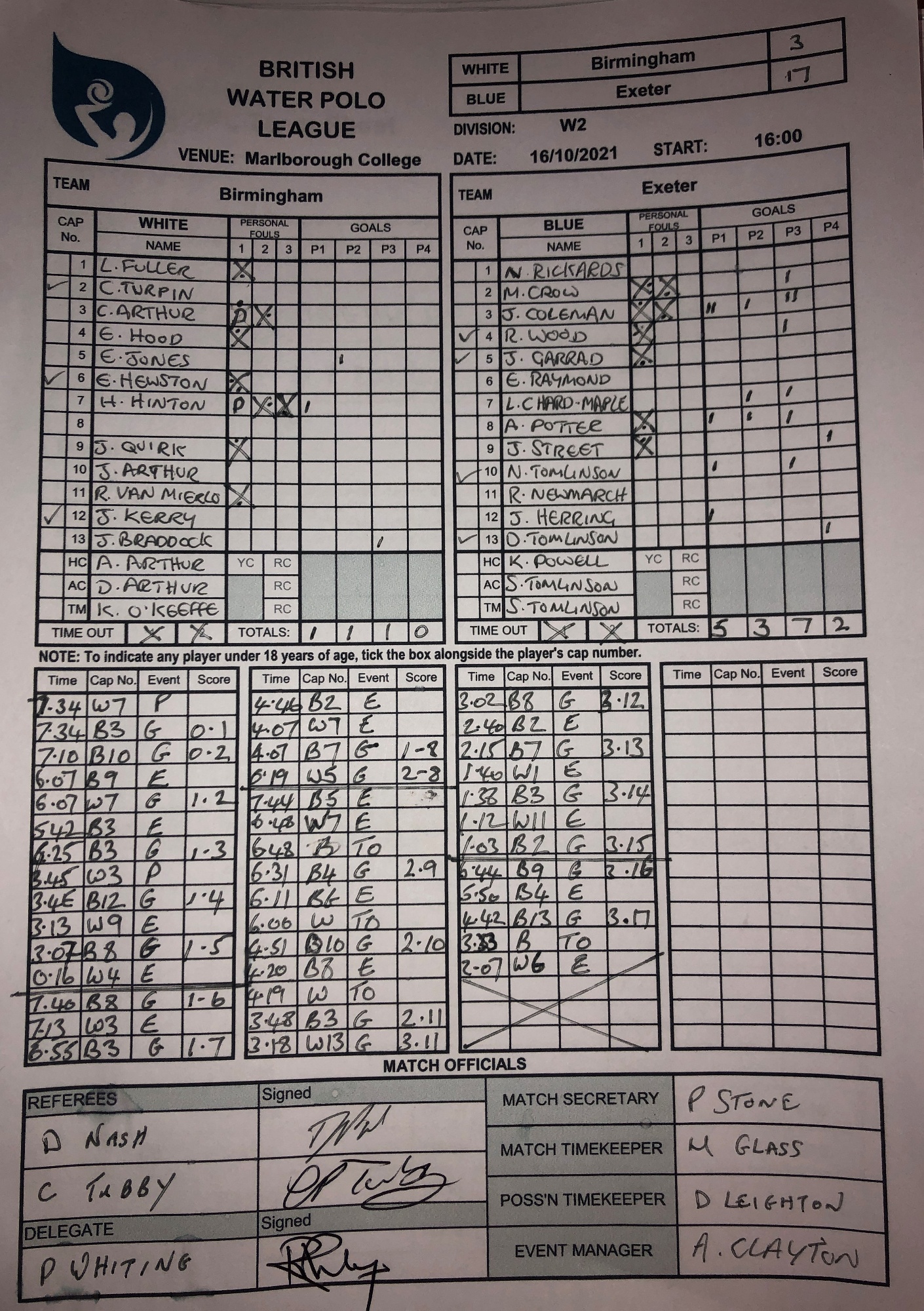 BWPL Ladies Result - Marlborough 16/10/21 (Day 1) Exeter 17 - 3 Birmingham