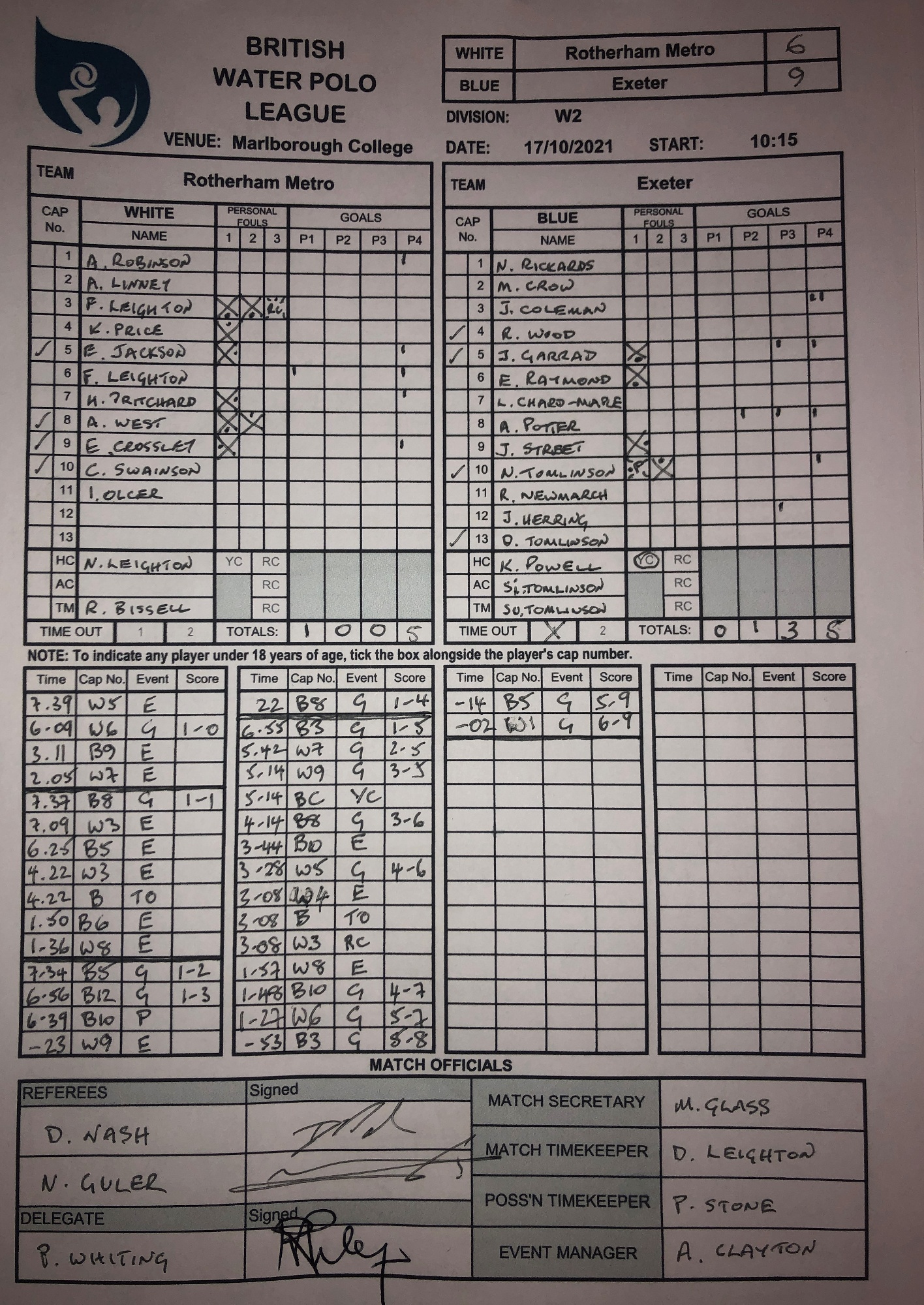 BWPL Ladies Result - Marlborough 17/10/21 (Day 2) Exeter 9 - 6 Rotherham Metro