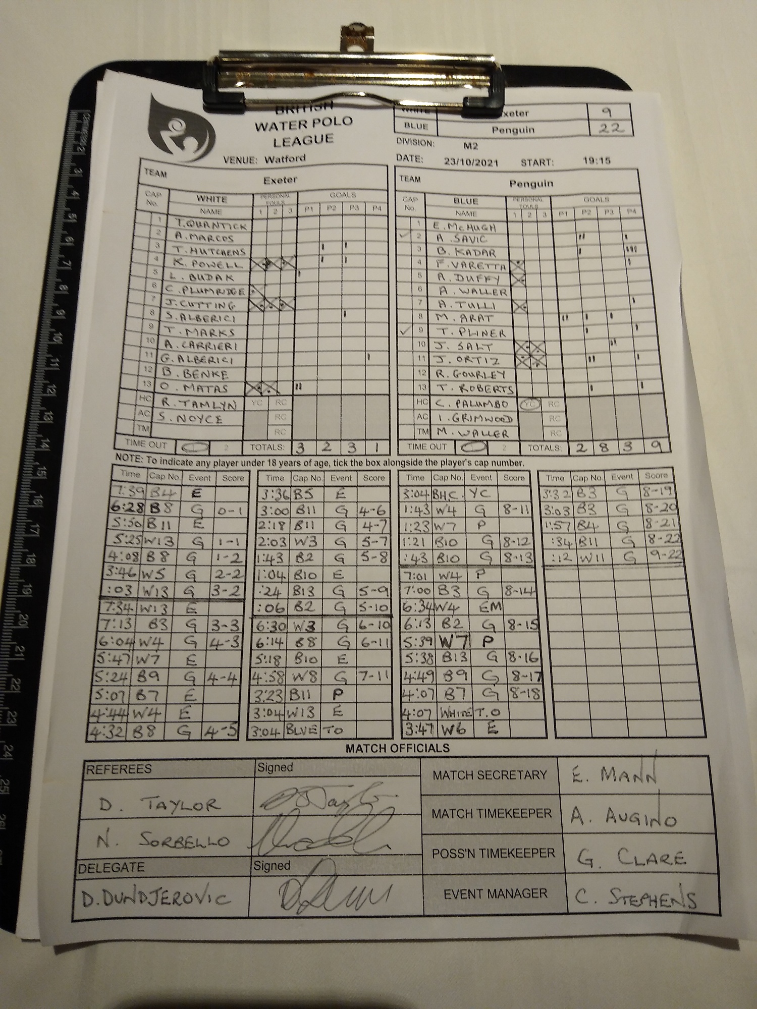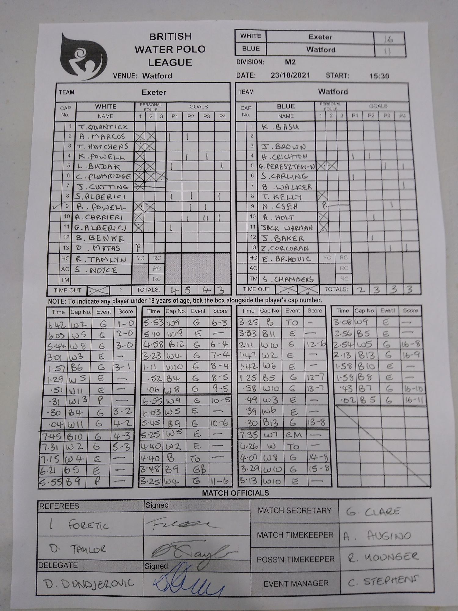 BWPL Men's Result - Watford 23/10/21 (Day 1) Exeter 16 - 11 Watford + Exeter 9 - 22 Penguin