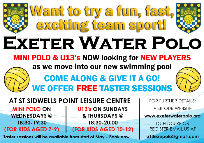 With our fantastic new swimming pool at St Sidwell’s Point Leisure Centre opening at the beginning of May, we are looking for more Mini Polo and U13 Players, and we offer FREE taster sessions!